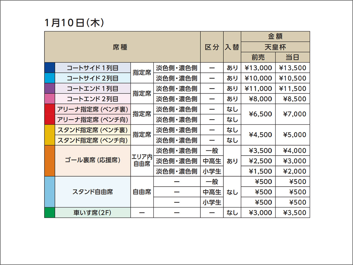 - コートサイド1列目・2列目、コートエンド1列目・2列目、ゴール裏席(応援席)は、1試合毎の入替制となります。当該試合以外は、スタンド自由席での観戦が可能です