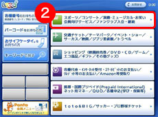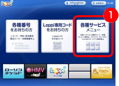 ![]() ローソン・ミニストップ店内に設置の「Loppi」の画面で「各種サービスメニュー」をタッチしてください。 |