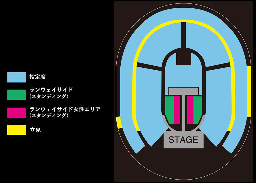指定席 8,500円 ランウェイサイド(スタンディング) 9,500円 ランウェイサイド女性エリア(スタンディング) 9,500円 立見:8,000円