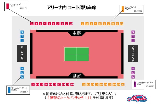 ・HOME側コートサイド左右に10席ずつ配置(全20席)