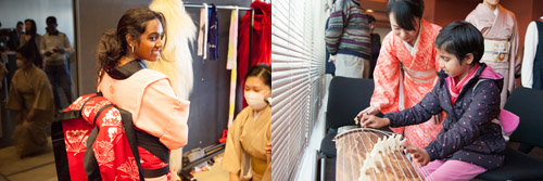 三味線や太鼓などの和楽器や日本舞踊の舞台化粧や衣装などの体験に加え、