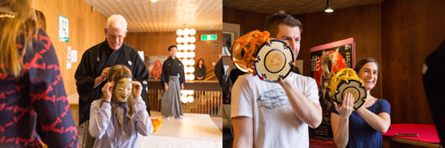 左/能面着用体験の様子 右/鼓演奏の体験
