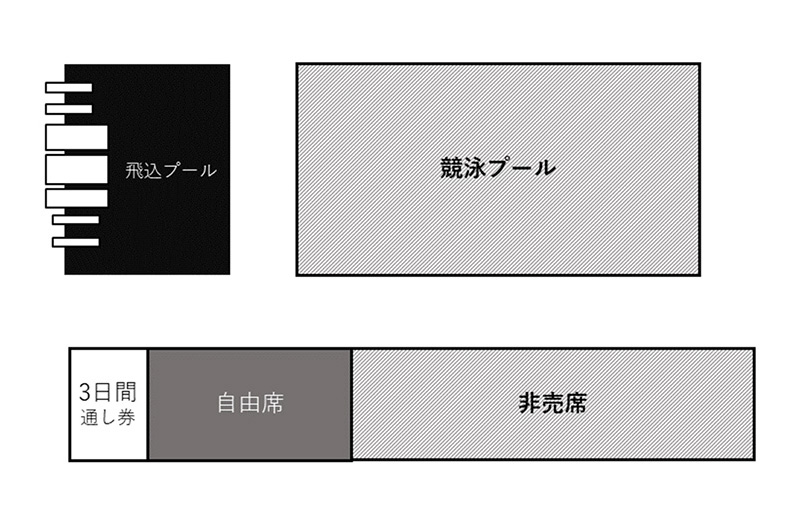 個人競技/1m飛板飛込、3m飛板飛込、高飛込 シンクロナイズド競技/3m飛板飛込、10m高飛込